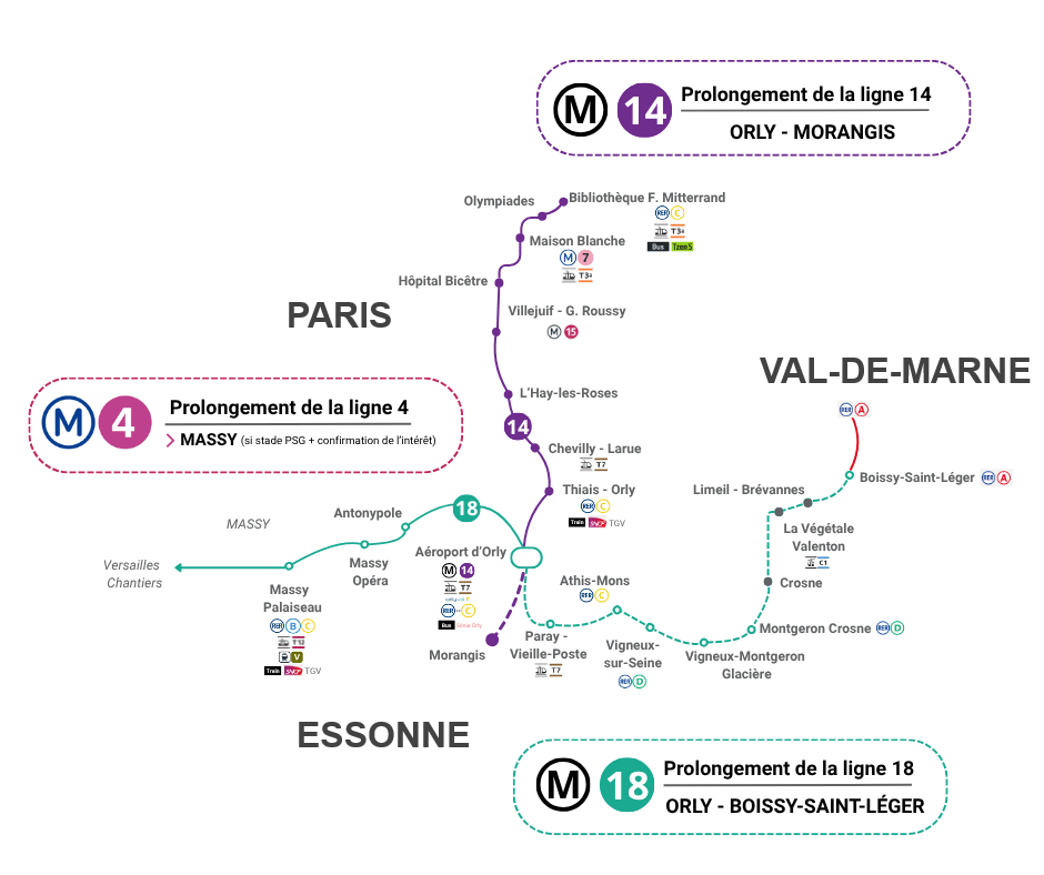 Communiqué de presse de l’étude pour le prolongement de la ligne 18 : https://bit.ly/44slFIH